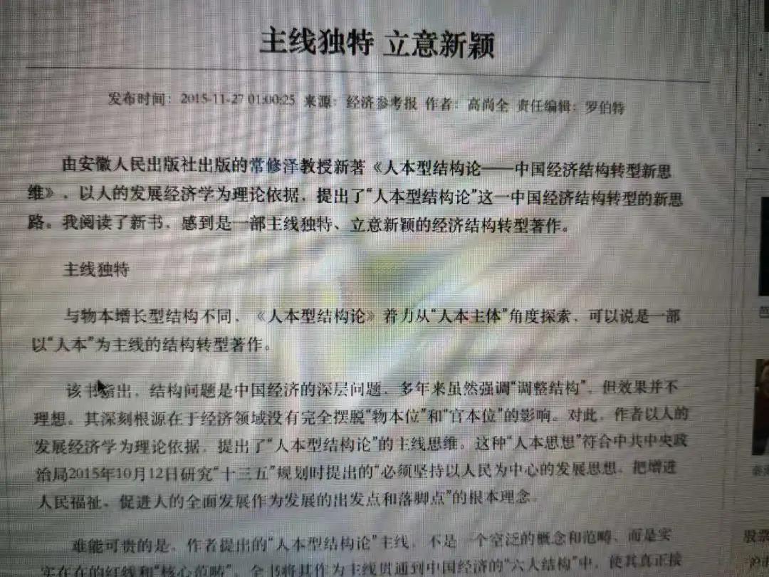 七年后,2008年,人本經(jīng)濟學(xué)研究成果專著之一《人本體制論——中國人的發(fā)展及體制安排研究》出版。又過七年,2015年,人本經(jīng)濟學(xué)研究成果專著之二《人本型結(jié)構(gòu)論——中國經(jīng)濟結(jié)構(gòu)轉(zhuǎn)型新思維》也出版問世。在書中,按照我的人本經(jīng)濟學(xué)理念,特別挖掘了馬克思在《政治經(jīng)濟學(xué)批判導(dǎo)言》中關(guān)于“人”是主人、“品”是“仆役”的思想,試圖與傳統(tǒng)的“物本經(jīng)濟學(xué)”和“權(quán)本經(jīng)濟學(xué)”“ 劃清界限。我沒有忘記:出版后,您在《經(jīng)濟參考報》撰文給予支持,題目雖然只有八個字:“主線獨特.立意新穎”,但觀點鮮明,呵護有加,頗感溫暖(見高尚全:《主線獨特.立意新穎》,《經(jīng)濟參考報》2015年12月1日)。