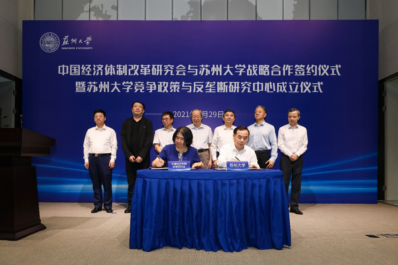 9月29日上午,彭森會(huì)長(zhǎng)出席了中國(guó)經(jīng)濟(jì)體制改革研究會(huì)與蘇州大學(xué)共同舉辦的戰(zhàn)略合作協(xié)議簽署暨蘇州大學(xué)競(jìng)爭(zhēng)政策與反壟斷研究中心揭牌儀式。蘇州大學(xué)黨委書記江涌代表蘇州大學(xué)致歡迎辭,彭森會(huì)長(zhǎng)、江蘇省市場(chǎng)監(jiān)管局陳琪宏副局長(zhǎng)、蘇州市副市長(zhǎng)楊知評(píng)為會(huì)議致辭。