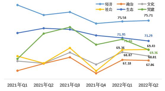 1、經(jīng)濟(jì)、社會(huì)領(lǐng)域小幅上升。從六大領(lǐng)域來看,經(jīng)濟(jì)領(lǐng)域得分75.71,政治領(lǐng)域得分67.06 ,文化領(lǐng)域得分68.01,社會(huì)領(lǐng)域得分69.43,生態(tài)領(lǐng)域得分71.29,黨建領(lǐng)域得分69.36。與上一季度相比,經(jīng)濟(jì)、社會(huì)領(lǐng)域小幅上升,其他領(lǐng)域均下降。其中黨建領(lǐng)域降幅最大,下降2.3。
