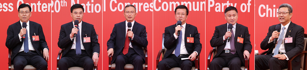 10月20日,中國共產(chǎn)黨第二十次全國代表大會新聞中心舉行集體采訪。青海、寧夏、新疆、中央和國家機關(guān)、中央金融系統(tǒng)、中央企業(yè)系統(tǒng)(在京)代表團新聞發(fā)言人出席,介紹代表團學習討論二十大報告情況,并回答記者提問(拼版照片)。新華社記者 張玉薇 攝