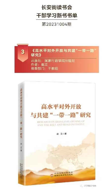 2023年10月18日,在第三屆“一帶一路”國際合作高峰論壇在北京隆重舉辦之際,長安街讀書會發(fā)布第20231004期干部學習新書書單,我會常務副會長兼秘書長趙艾新著《高水平對外開放與共建“一帶一路”研究》名列推薦榜單。