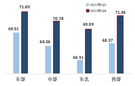從四大區(qū)域來(lái)看,東部、中部、東北、西部地區(qū)指數(shù)分別為71.80、70.78、69.89、71.36。四大區(qū)域排名與上一季度沒(méi)有變化,改革熱度指數(shù)均有上升,東北地區(qū)提升幅度最大。