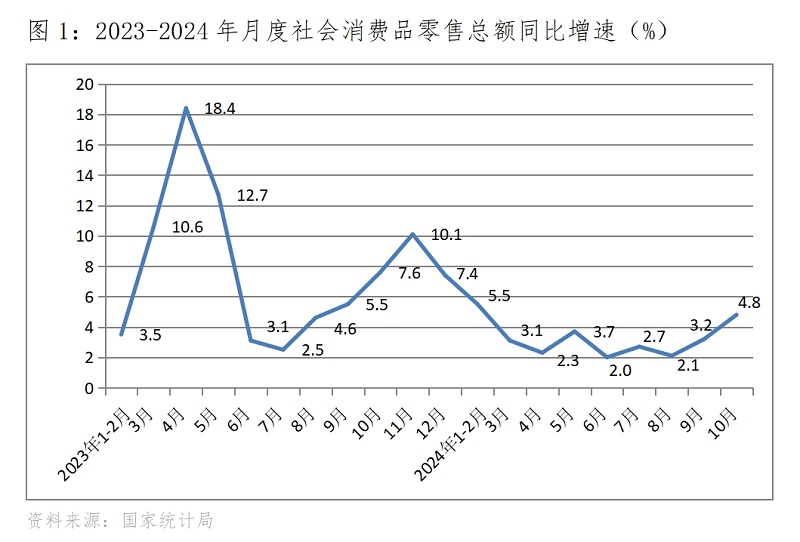 (一)零售增速繼續(xù)回升。10月份,社會(huì)消費(fèi)品零售總額同比增長(zhǎng)4.8%,比9月份增長(zhǎng)3.2%回升了1.6個(gè)百分點(diǎn),9月份比8月份增長(zhǎng)2.1%回升了1.1個(gè)百分點(diǎn)。社會(huì)消費(fèi)品零售總額增速的持續(xù)回升,既反映了政策措施取得了積極效果,也說(shuō)明消費(fèi)者對(duì)有效政策措施的響應(yīng)較為積極。隨著消費(fèi)品以舊換新政策措施力度的不斷加大,家用電器和音像器材以及汽車(chē)零售額增長(zhǎng)加快或由負(fù)轉(zhuǎn)正,10月份限額以上企業(yè)家用電器和音像器材零售額增長(zhǎng)39.2%,比9月份加快17.7個(gè)百分點(diǎn),9月份比8月份加快17.1個(gè)百分點(diǎn);汽車(chē)零售額增長(zhǎng)3.7%,比9月份加快3.3個(gè)百分點(diǎn),9月份為增長(zhǎng)0.4%,8月份為下降7.3%。可見(jiàn),實(shí)施有效的政策措施對(duì)擴(kuò)大消費(fèi)的效果是明顯的積極的。