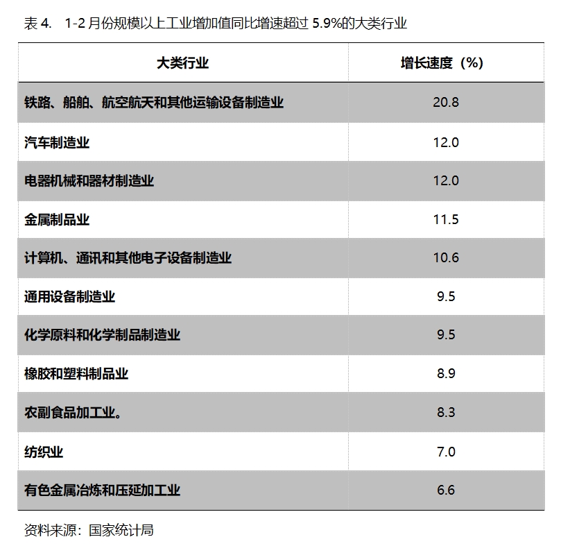 1-2月份,增長(zhǎng)速度超過(guò)規(guī)模以上工業(yè)增長(zhǎng)5.9%的主要大類行業(yè)共有11個(gè),即鐵路、船舶、航空航天和其他運(yùn)輸設(shè)備制造業(yè)增長(zhǎng)20.8%,汽車制造業(yè)增長(zhǎng)12.0%,電器機(jī)械和器材制造業(yè)增長(zhǎng)12.0%,金屬制品業(yè)增長(zhǎng)11.5%,計(jì)算機(jī)、通訊和其他電子設(shè)備制造業(yè)增長(zhǎng)10.6%,通用設(shè)備制造業(yè)增長(zhǎng)9.5%,化學(xué)原料和化學(xué)制品制造業(yè)增長(zhǎng)9.5%,橡膠和塑料制品業(yè)增長(zhǎng)8.9%,農(nóng)副食品加工業(yè)增長(zhǎng)8.3%,紡織業(yè)增長(zhǎng)7.0%,有色金屬冶煉和壓延加工業(yè)增長(zhǎng)6.6%。