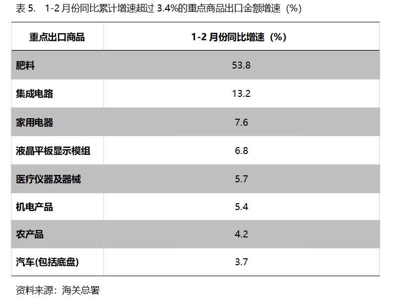 1-2月份,出口金額同比增速超過(guò)3.4%的重點(diǎn)商品共有8類,即肥料出口增長(zhǎng)53.8%,集成電路增長(zhǎng)13.2%,家用電器增長(zhǎng)7.6%,液晶平板顯示模組增長(zhǎng)6.8%,醫(yī)療儀器及器械增長(zhǎng)5.7%,機(jī)電產(chǎn)品增長(zhǎng)5.4%,農(nóng)產(chǎn)品增長(zhǎng)4.2%,汽車(包括底盤)增長(zhǎng)3.7%。