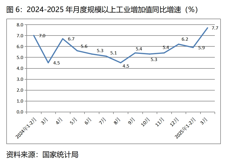 (一)工業(yè)生產(chǎn)增速比上年全年和上年同期均保持回升。一季度規(guī)模以上工業(yè)增加值同比增長(zhǎng)6.5%,比上年全年增長(zhǎng)5.8%回升0.7個(gè)百分點(diǎn),比上年同期增長(zhǎng)6.1%回升0.4個(gè)百分點(diǎn)。其中,3月份規(guī)模以上工業(yè)生產(chǎn)增長(zhǎng)7.7%,不僅比1-2月份增速有明顯的回升,而且也是近幾年以來月度規(guī)模以上工業(yè)生產(chǎn)增長(zhǎng)最快的一個(gè)月份。