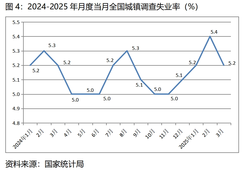 (三)調(diào)查失業(yè)率比上年四季度和上年同期均略有回升。一季度平均調(diào)查失業(yè)率為5.3%,比上年四季度的5.0%回升0.3個(gè)百分點(diǎn),比上年同期的5.2%回升了0.1個(gè)百分點(diǎn),其中1月份為5.2%,2月份為5.4%,3月份為5.2%,總體上保持了基本穩(wěn)定的態(tài)勢(shì)。