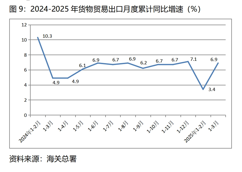 (四)貨物出口增速比上年全年有所回落,比上年同期回升。一季度貨物出口總值同比增長(zhǎng)6.9%,比上年全年增長(zhǎng)7.1%回落0.2個(gè)百分點(diǎn),比上年同期增長(zhǎng)4.9%回升2.0個(gè)百分點(diǎn),其中對(duì)歐盟出口同比增長(zhǎng)4.9%,上年同期為下降2.6%;對(duì)美國(guó)出口增長(zhǎng)5.6%,比上年同期增長(zhǎng)2.1%加快3.5個(gè)百分點(diǎn);對(duì)東盟出口增長(zhǎng)9.2%,比上年同期增長(zhǎng)7.7%加快1.5個(gè)百分點(diǎn);對(duì)拉丁美洲出口增長(zhǎng)10.7%,比上年同期增長(zhǎng)13.0%回落了2.3個(gè)百分點(diǎn)。