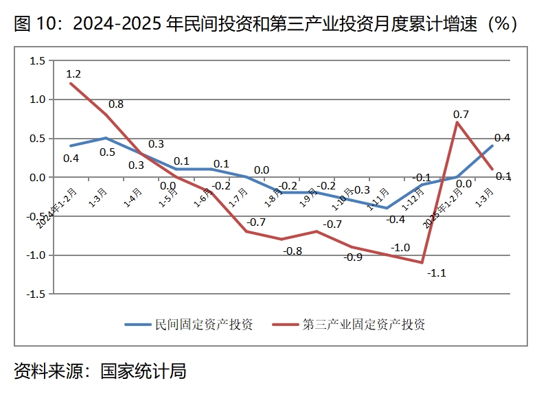 (一)民間投資和第三產(chǎn)業(yè)投資增長(zhǎng)仍比較緩慢,增速比上年全年和上年同期均變化不大。一季度民間固定資產(chǎn)投資同比增長(zhǎng)0.4%,上年全年為下降0.1%,比上年同期增長(zhǎng)0.5%回落0.1個(gè)百分點(diǎn);一季度第三產(chǎn)業(yè)固定資產(chǎn)投資同比增長(zhǎng)0.1%,上年全年為下降1.1%,比上年同期增長(zhǎng)0.8%回落0.7個(gè)百分點(diǎn)。這說明民營(yíng)經(jīng)濟(jì)和第三產(chǎn)業(yè)生產(chǎn)經(jīng)營(yíng)活力還比較弱。