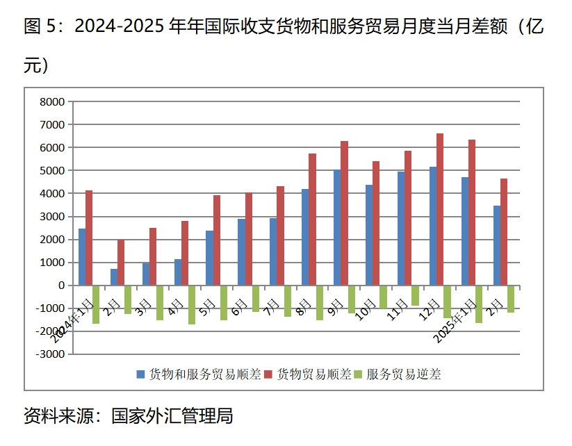 (四)國(guó)際收支貨物和服務(wù)貿(mào)易順差增加。今年1月份國(guó)際收支貨物和服務(wù)貿(mào)易順差4711億元,比上年同月的2459億元增加2252億元;2月份順差3459億元,比上年同月的724億元增加2735億元,國(guó)際收支貨物和服務(wù)貿(mào)易繼續(xù)保持多年以來順差的態(tài)勢(shì),同時(shí)今年以來的順差比上年同期增加較多。國(guó)際收支貨物和服務(wù)順差中,貨物貿(mào)易繼續(xù)保持順差,服務(wù)貿(mào)易仍然保持逆差。1月份國(guó)際收支貨物貿(mào)易順差6342億元,服務(wù)貿(mào)易逆差1631億元;2月份國(guó)際收支貨物貿(mào)易順差4638億元,服務(wù)貿(mào)易逆差1178億元。在國(guó)際環(huán)境趨于更加復(fù)雜嚴(yán)峻形勢(shì)下,國(guó)際收支貨物和服務(wù)貿(mào)易仍實(shí)現(xiàn)較大順差,充分說明我國(guó)經(jīng)濟(jì)有著較強(qiáng)的韌性和回旋空間。