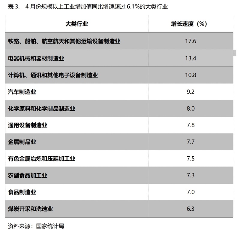 4月份,增長速度超過規(guī)模以上工業(yè)增長6.1%的主要大類行業(yè)共有11個,即鐵路、船舶、航空航天和其他運輸設(shè)備制造業(yè)增長17.6%,電器機(jī)械和器材制造業(yè)增長13.4%,計算機(jī)、通訊和其他電子設(shè)備制造業(yè)增長10.8%,汽車制造業(yè)增長9.2%,化學(xué)原料和化學(xué)制品制造業(yè)增長8.0%,通用設(shè)備制造業(yè)增長7.8%,金屬制品業(yè)增長7.7%,有色金屬冶煉和壓延加工業(yè)增長7.5%,農(nóng)副食品加工業(yè)增長7.3%,食品制造業(yè)增長7.0%,煤炭開采和洗選業(yè)增長6.3%。