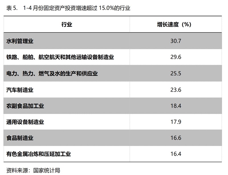 1-4月份,固定資產(chǎn)投資增速超過15%的主要行業(yè)共8個,即水利管理業(yè)增長30.7%,鐵路、船舶、航空航天和其他運輸設(shè)備制造業(yè)增長29.6%,電力、熱力、燃?xì)饧八纳a(chǎn)和供應(yīng)業(yè)增長25.5%,汽車制造業(yè)增長23.6%,農(nóng)副食品加工業(yè)增長18.4%,通用設(shè)備制造業(yè)增長17.9%,食品制造業(yè)增長16.6%,有色金屬冶煉和壓延加工業(yè)增長16.4%。