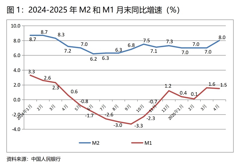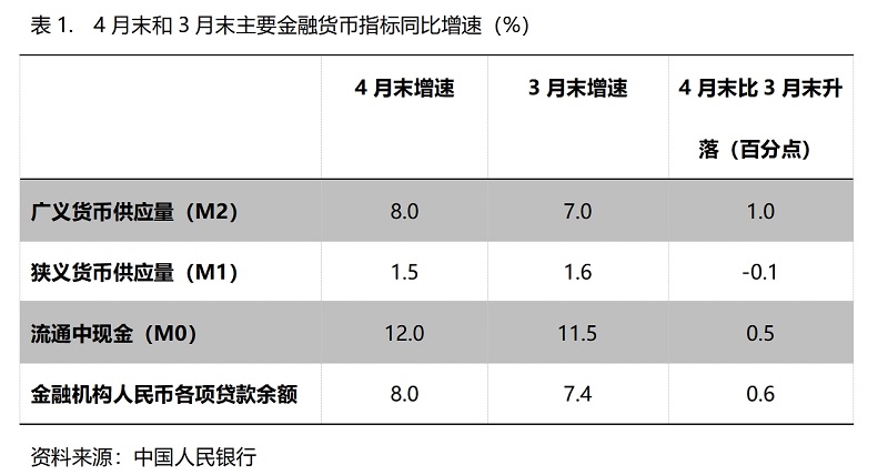 (一)M2增速由平轉(zhuǎn)升。4月末,廣義貨幣供應(yīng)量(M2)同比增長8.0%,比3月末增長7.0%回升1.0個百分點,實際上這是在今年前三個月末連續(xù)保持7.0%增速基礎(chǔ)上的回升;狹義貨幣供應(yīng)量(M1)增速比上月略有回落,4月末同比增長1.5%,比3月末增長1.6%回落0.1個百分點,而3月末增幅比2月末增幅回升1.5個百分點;流通中貨幣(M0)增速由升轉(zhuǎn)落,4月末同比增長12.0%,比3月末增長11.5%回升0.5個百分點,而3月末增速比2月末增速回升了1.8個百分點。貨幣政策正按照適度寬松的要求運行,這對推動經(jīng)濟(jì)回升將發(fā)揮積極作用,但各層次貨幣供應(yīng)量增速較大差異反映出的問題需引起關(guān)注。