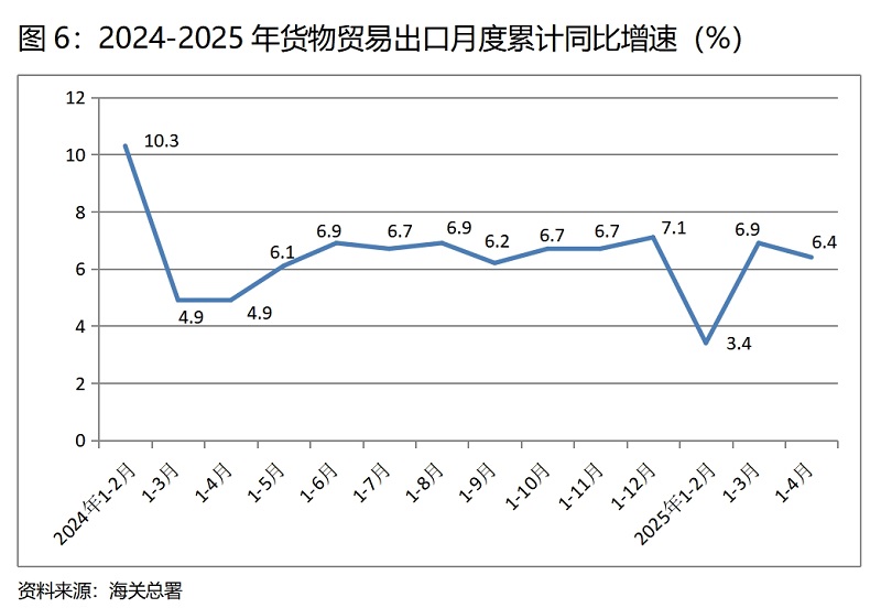 (六)貨物出口增速由升轉(zhuǎn)落。1-4月份,貨物出口同比增長6.4%,比1-3月份增長6.9%回落0.5個百分點,1-3月份比1-2月份回升3.5個百分點,增速呈現(xiàn)出由升轉(zhuǎn)落的態(tài)勢。貨物出口對主要貿(mào)易出口經(jīng)濟(jì)體增速有平有落也有升,1-4月份對歐盟出口同比增長4.9%,與1-3月份4.9%的增速持平;對美國出口下降2.5%,1-3月份增長5.6%,增速由增長轉(zhuǎn)為下降;對東盟出口增長11.5%,比1-3月份增長9.2%回升2.3個百分點;對拉丁美洲出口增長11.5%,比1-3月份增長10.7%回升0.8個百分點。在美國濫用關(guān)稅政策、對美國出口出現(xiàn)下降的情況下,我國出口仍能保持較快增長,特別是對一些主要經(jīng)濟(jì)體增長呈現(xiàn)加快的勢頭,充分說明我國出口不僅有較強的競爭力,也有較強的韌性。