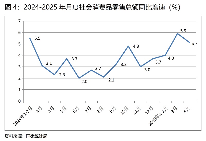 (四)零售增速由升轉(zhuǎn)落。4月份,社會消費品零售總額同比增長5.1%,比3月份增長5.8%回落了0.7個百分點,3月份比1-2月份增長4.0%回升了1.9個百分點。4月份社會消費品零售總額增速的回落,盡管有汽車及其油價下降的因素,但應(yīng)看到這是在上年同期基數(shù)較低基礎(chǔ)上的回落,說明消費需求不足的問題仍還比較突出,在面對較大不確定性的國際局勢,研究謀劃更加有效的擴(kuò)大消費特別是服務(wù)消費的政策措施顯得十分重要。