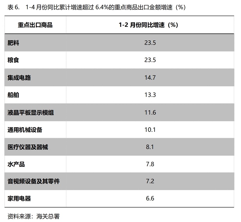 1-4月份,出口金額同比增速超過6.4%的重點商品共有10類,即肥料出口增長23.5%,糧食增長23.5%,集成電路增長14.7%,船舶增長13.3%,液晶平板顯示模組增長11.6%,通用機(jī)器設(shè)備增長10.1%,醫(yī)療儀器及器械增長8.1%,水產(chǎn)品增長7.8%,音視頻設(shè)備及其零件增長7.2%,家用電器增長6.6%。