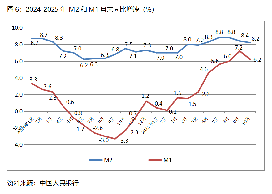 六、M2增速持續(xù)回落。10月末,廣義貨幣供應(yīng)量(M2)同比增長(zhǎng)8.2%,比9月末增長(zhǎng)8.4%回落0.2個(gè)百分點(diǎn),9月末比8月末增長(zhǎng)8.8%回落0.4個(gè)百分點(diǎn);狹義貨幣供應(yīng)量(M1)同比增長(zhǎng)6.2%,比9月末增長(zhǎng)7.2%回落1.0個(gè)百分點(diǎn),9月末增幅比8月末增長(zhǎng)6.0%回升1.2個(gè)百分點(diǎn);流通中貨幣(M0)同比增長(zhǎng)10.6%,比9月末增長(zhǎng)11.5%回落0.9個(gè)百分點(diǎn),9月末比8月末增長(zhǎng)11.7%回落0.2個(gè)百分點(diǎn)。10月份末,M2、M1和M0增速均出現(xiàn)了回落,需要關(guān)注其對(duì)經(jīng)濟(jì)運(yùn)行走勢(shì)的影響。