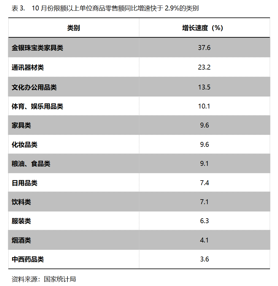 10月份,限額以上單位商品零售額同比增速快于社會(huì)消費(fèi)品零售總額2.9%增速的共有12類,即金銀珠寶類增長(zhǎng)37.6%,通訊器材類增長(zhǎng)23.2%,文化辦公用品類增長(zhǎng)13.5%,體育、娛樂用品類增長(zhǎng)10.1%,家具類增長(zhǎng)9.6%,化妝品類增長(zhǎng)9.6%,糧油、食品類增長(zhǎng)9.1%,日用品類增長(zhǎng)7.4%,飲料類增長(zhǎng)7.1%。服裝類增長(zhǎng)6.3%。煙酒類增長(zhǎng)4.1%,中西藥品類增長(zhǎng)3.6%。