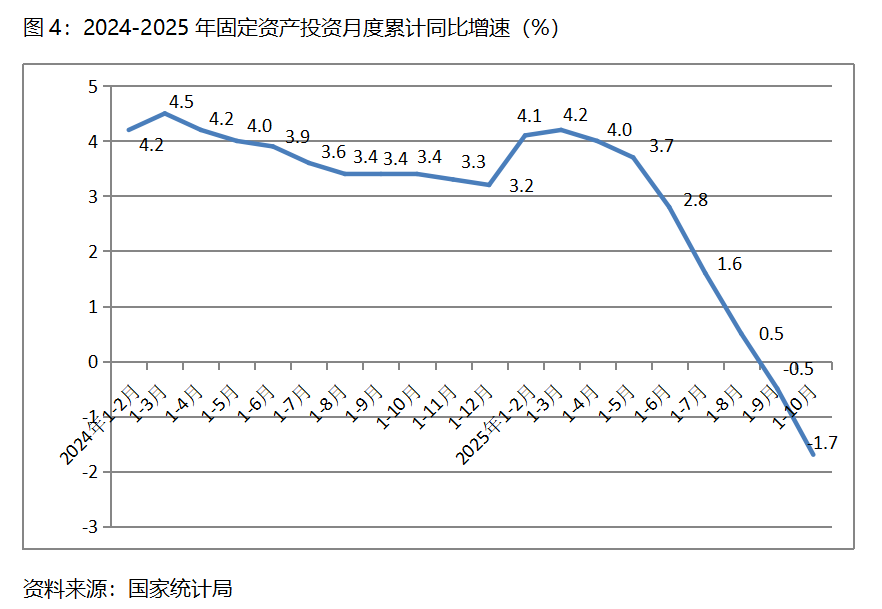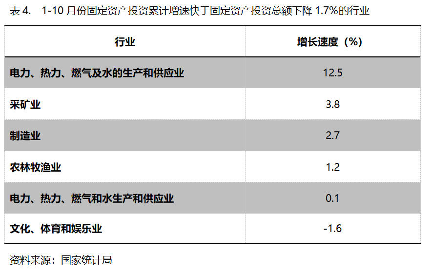 1-10月份,固定資產(chǎn)投資累計(jì)增速快于固定資產(chǎn)投資總額下降1.7%的行業(yè)共6個(gè),即電力、熱力、燃?xì)饧八纳a(chǎn)和供應(yīng)業(yè)增長(zhǎng)12.5%,采礦業(yè)增長(zhǎng)3.8%,制造業(yè)增長(zhǎng)2.7%。農(nóng)林牧漁業(yè)增長(zhǎng)1.2%,交通運(yùn)輸、倉(cāng)儲(chǔ)和郵政業(yè)增長(zhǎng)0.1%,文化、體育和娛樂業(yè)下降1.6%。