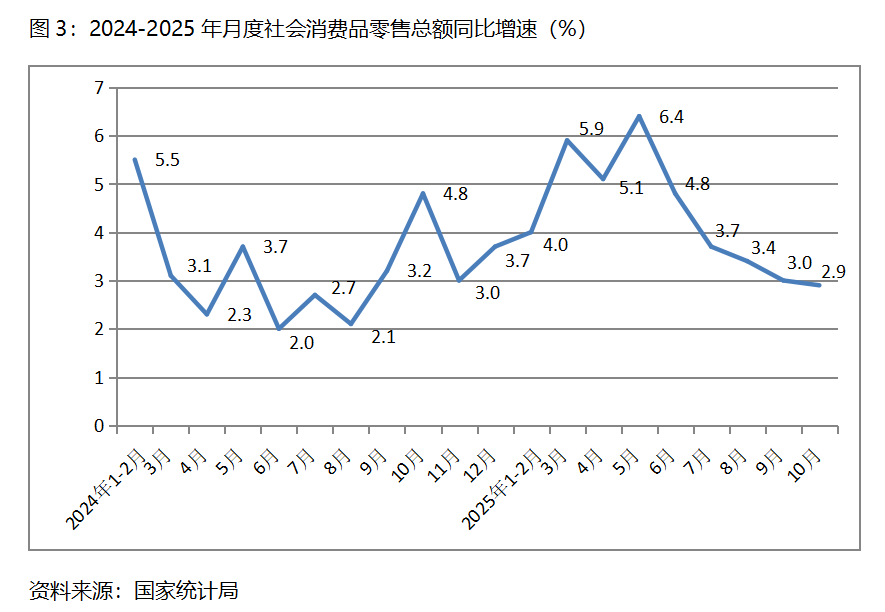 三、零售增速持續(xù)回落。10月份,社會(huì)消費(fèi)品零售總額同比增長(zhǎng)2.9%,比9月份增長(zhǎng)3.0%回落了0.1個(gè)百分點(diǎn),9月份比8月份增長(zhǎng)3.4%回落了0.4個(gè)百分點(diǎn),其中,餐飲收入增速回升,商品零售額增速回落,10月份餐飲收入同比增長(zhǎng)3.8%,比9月份增長(zhǎng)0.9%回升了2.9個(gè)百分點(diǎn);商品零售額增長(zhǎng)2.8%,比9月份增長(zhǎng)3.3%回落0.5個(gè)百分點(diǎn)。10月份社會(huì)消費(fèi)品零售總額增速是今年以來月份的最低增速。