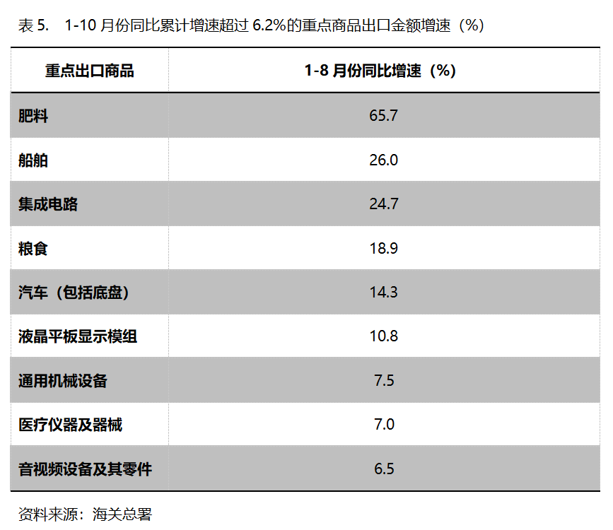 1-10月份,出口金額同比增速超過6.2%的重點(diǎn)商品共有9類,即肥料出口增長(zhǎng)65.7%,船舶增長(zhǎng)26.0%,集成電路增長(zhǎng)24.7%,糧食增長(zhǎng)18.9%,汽車(包括底盤)增長(zhǎng)14.3%,液晶平板顯示模組增長(zhǎng)10.8%,通用機(jī)器設(shè)備增長(zhǎng)7.5%,醫(yī)療儀器及器械增長(zhǎng)7.0%,音視頻設(shè)備及其零件增長(zhǎng)6.5%。