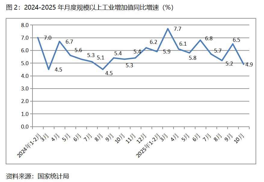 二、工業(yè)增速由升轉(zhuǎn)落。10月份,規(guī)模以上工業(yè)增加值同比增長(zhǎng)4.9%,比9月份增長(zhǎng)6.5%回落了1.6個(gè)百分點(diǎn),9月份比8月份增長(zhǎng)5.2%回升了1.3個(gè)百分點(diǎn)。從工業(yè)三大門類看,采礦業(yè)和制造業(yè)增速比上月回落,電力、熱力、燃?xì)饧八a(chǎn)和供應(yīng)業(yè)增速回升,10月份,采礦業(yè)同比增長(zhǎng)4.5%,比上月增長(zhǎng)6.4%回落1.9個(gè)百分點(diǎn);制造業(yè)增長(zhǎng)4.9%,比上月增長(zhǎng)7.3%回落2.4個(gè)百分點(diǎn);電力、熱力、燃?xì)饧八a(chǎn)和供應(yīng)業(yè)增長(zhǎng)5.4%,比上月增長(zhǎng)0.6%回升4.8個(gè)百分點(diǎn)。值得關(guān)注的是,10月份工業(yè)增速回落到了今年月份增速的最低點(diǎn)。