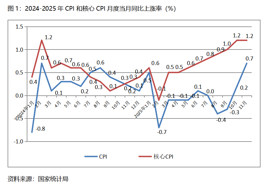 一、CPI漲幅持續(xù)回升。11月份,CPI同比上漲0.7%,比10月份上漲0.2%回升0.5個百分點,10月份由9月份下降0.3%轉(zhuǎn)為上漲;核心CPI同比上漲1.2%,與10月份上漲1.2%持平,10月份比9月份上漲1.0%回升了0.2個百分點。CPI漲幅回升較為為明顯,核心CPI漲幅保持穩(wěn)定,表明經(jīng)濟運行活力繼續(xù)增強,但由于漲幅仍較為有限,加之較長時期處于偏低水平,經(jīng)濟運行活力還有待進一步提高。