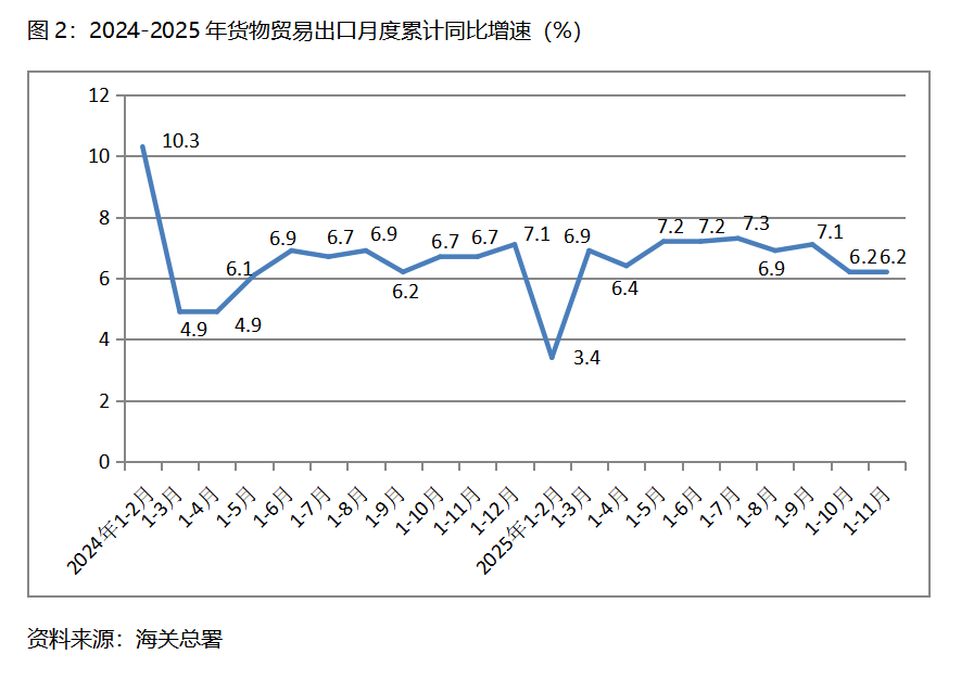二、出口增速由落轉(zhuǎn)平。1-11月份,貨物出口同比增長6.2%,與1-10月份增長6.2%持平,1-10月份比1-9月份增長7.1%回落0.9個百分點。貨物出口對主要貿(mào)易出口經(jīng)濟體增速有升有落有平,1-11月份對歐盟出口同比增長8.9%,比1-10月份對歐盟出口同比增長8.4%回升0.5個百分點;對美國出口下降18.3%,比1-10月份下降17.1%擴大1.2個百分點;對東盟出口增長14.6%,比1-10月份增長15.3%回落0.7個百分點;對拉丁美洲出口增長7.9%,比1-10月份增長7.3%回升0.6個百分點;對非洲出口增長27.2%,與1-10月份增長27.2%持平。貨物出口在跌宕起伏的國際形勢下仍保持穩(wěn)定增長,彰顯出我國對外貿(mào)易的較強韌性。