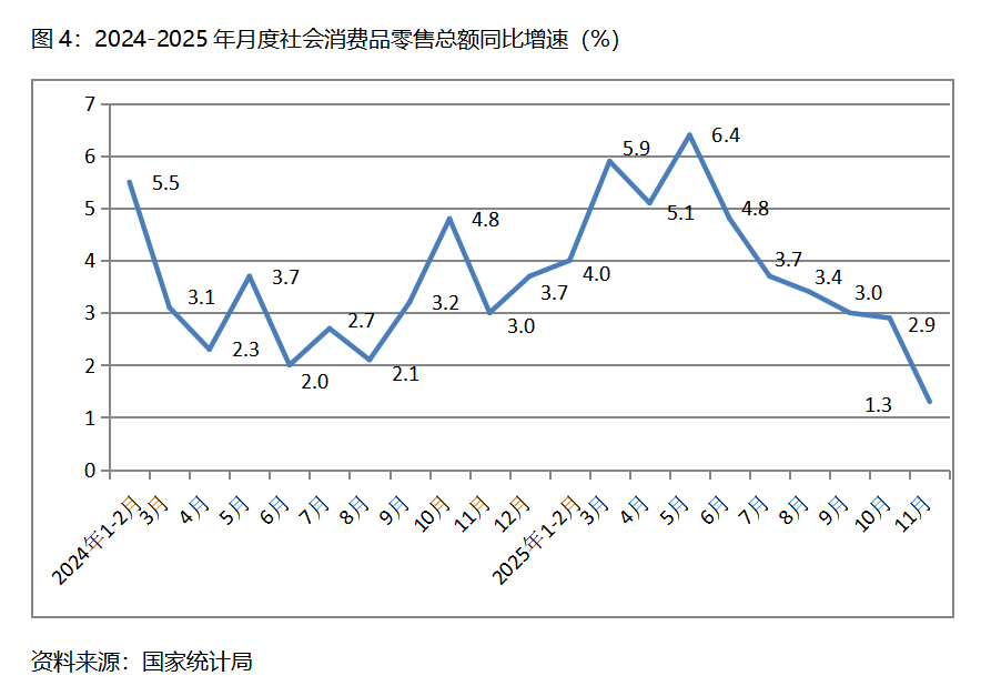 四、零售增速持續(xù)回落。11月份,社會消費品零售總額同比增長1.3%,比10月份增長2.9%回落了1.6個百分點,10月份比9月份增長3.0%回落了0.1個百分點,其中,餐飲收入和商品零售額增速均出現(xiàn)了回落,10月份餐飲收入同比增長3.2%,比10月份增長3.8%回落了0.6個百分點;商品零售額增長1.0%,比10月份增長2.8%回落1.8個百分點。社會消費品零售總額增速的持續(xù)回落,需要引起高度關(guān)注。